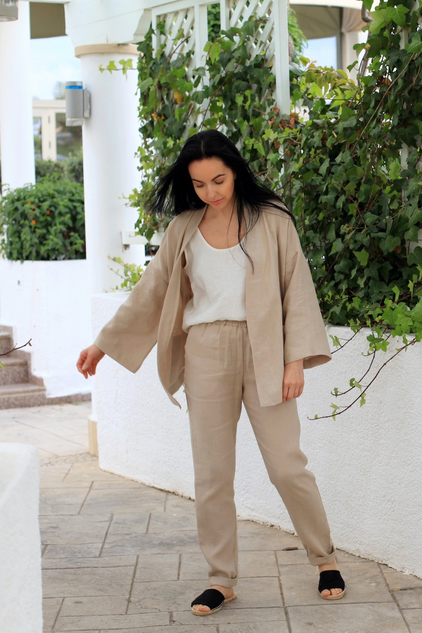 The April linen jacket is designed with an intentionally oversized fit for easy layering over dresses, tops, or trousers. The wide dropped shoulders and flowing kimono-style sleeves create a relaxed, modern silhouette that drapes softly without feeling restrictive.